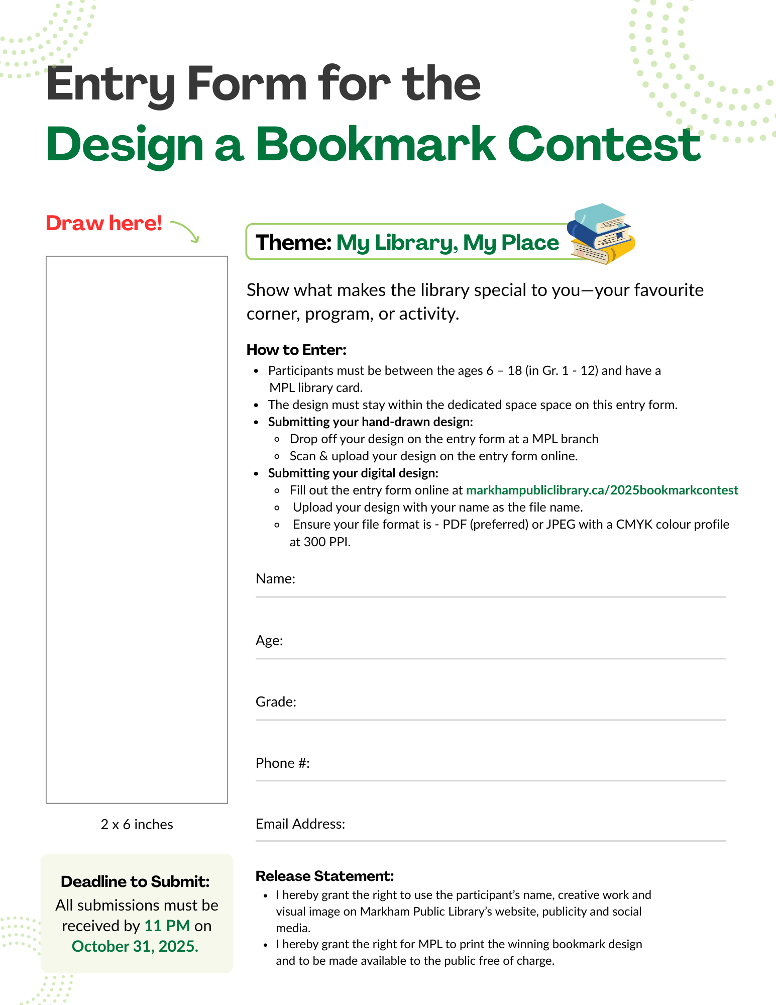 • Fill out the entry form online at markhampubliclibrary.ca/2025bookmarkcontest
